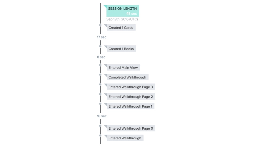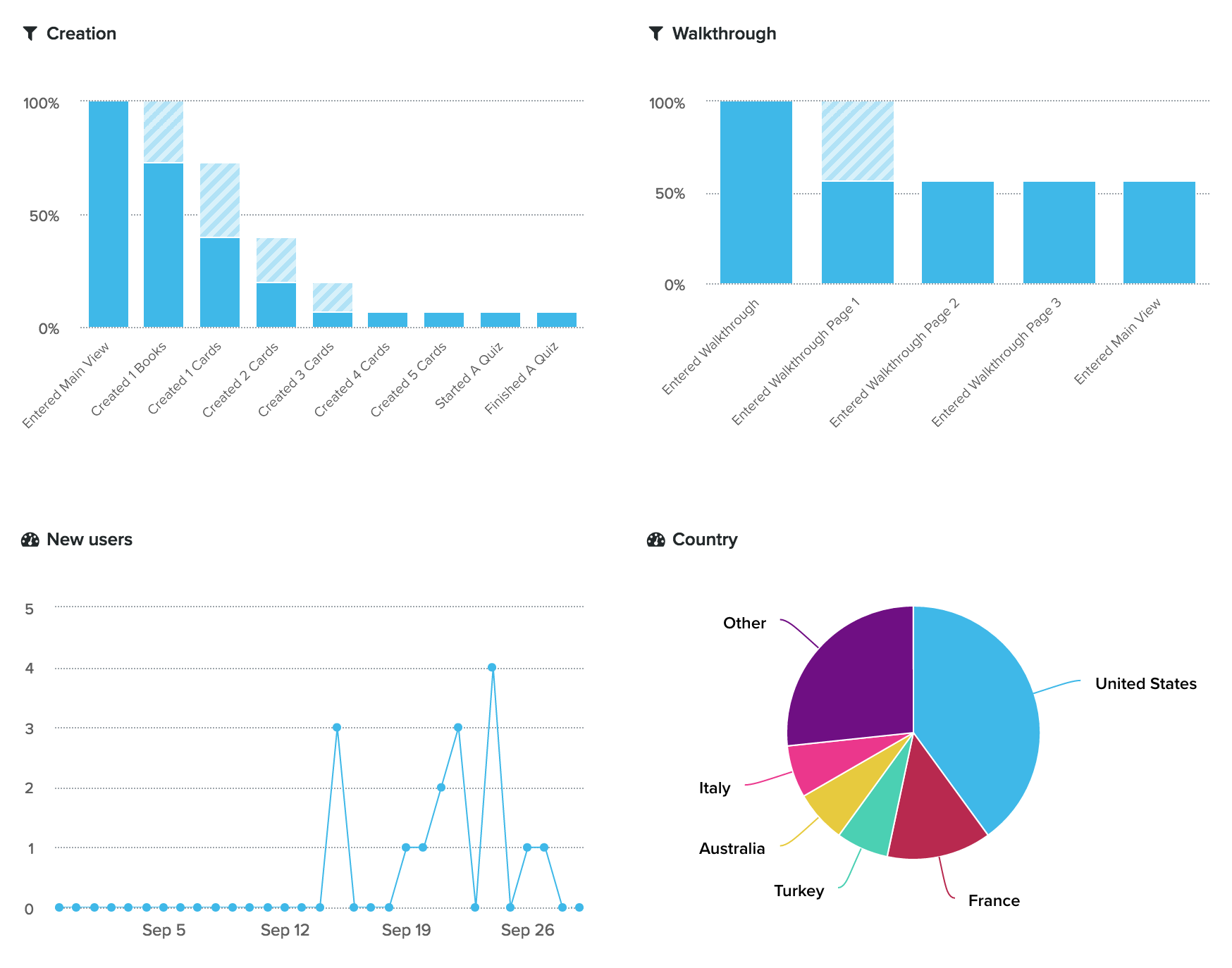 Note that those funnels show some really bad conversion rates! Only one user created more than 2 cards, and I'm pretty sure it's me 👋 ! Also it appears 44% new users skipped the walkthrough. But that's okay, now I can improve the app and compare the conversion rates to see what works and what doesn't.