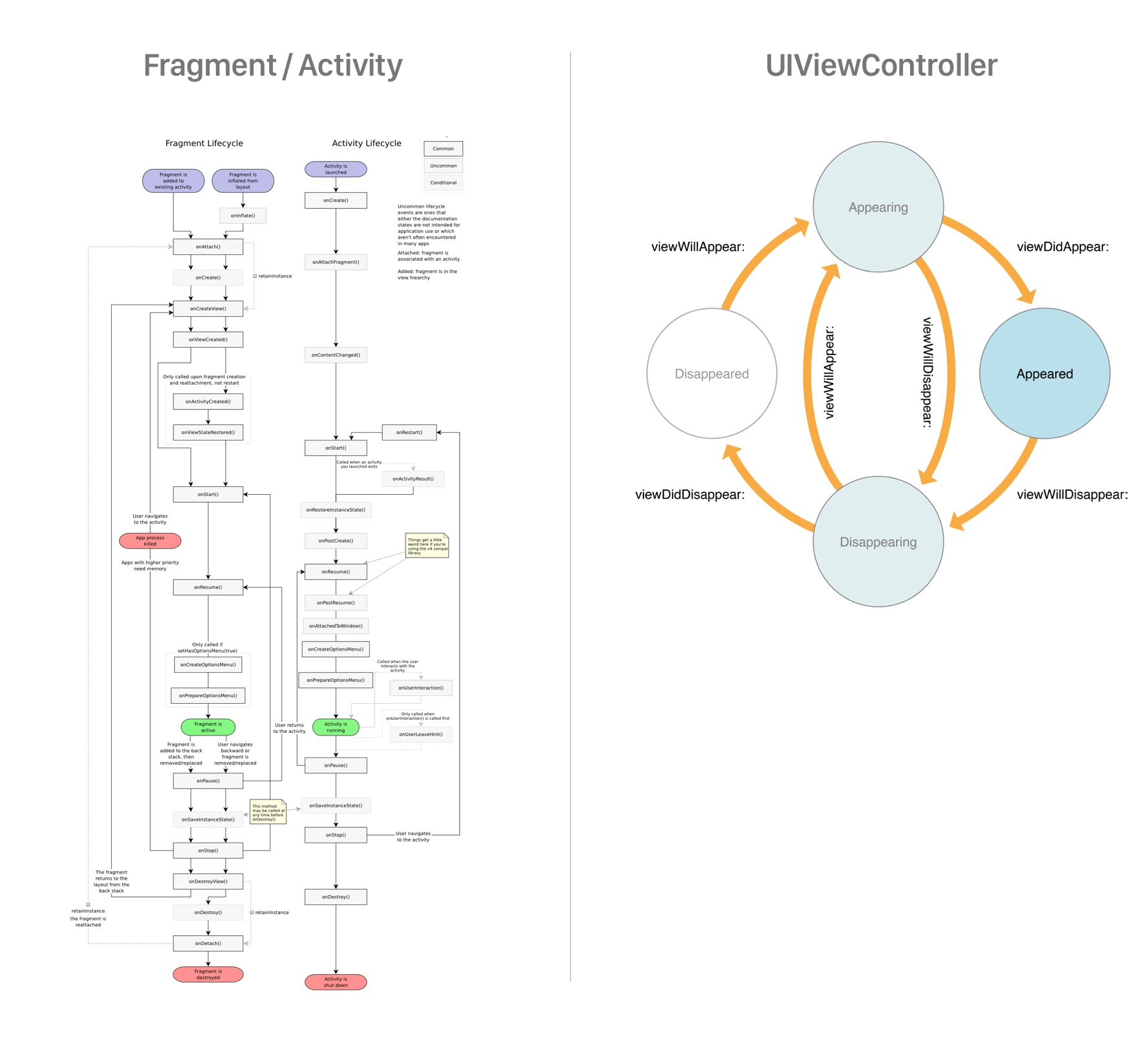 My general feeling is that iOS development is easier than Android development, and a very good example of that is the lifecycle complexity of Activity/Fragment vs UIViewController: